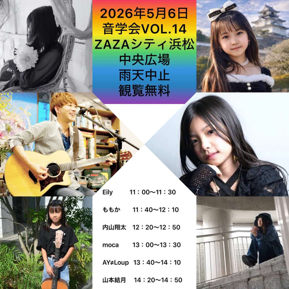 音楽会VOL.14 ZAZAシティ浜松 SCHEDULE 2026/05/06(水) 11:00 - 15:00 ZAZAシティ浜松 地図を表示 11時~14時50分 (出演順) Eily・ももか・内山翔太・moca・AY≠Loup・山本結月 雨天中止・閲覧無料 ZAZAシティ浜松で開催される音楽ライブになってます! moca出演時間13:00~13:30分 URLをコピーする 報告する